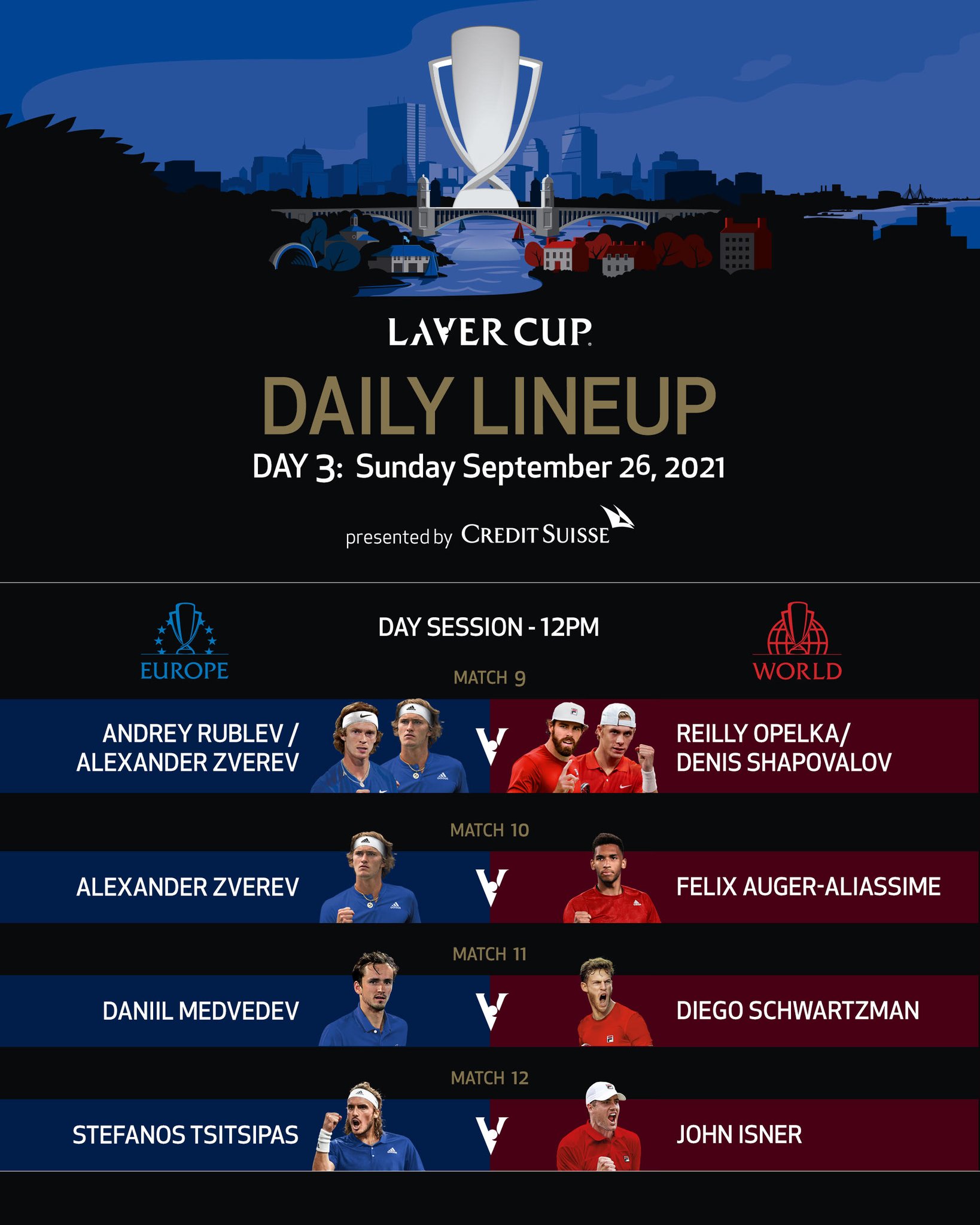 Europe vs The World. Get Session Times and Schedule For All the Matches of Laver Cup 2019. September 24-26 2021 Boston MA USA.